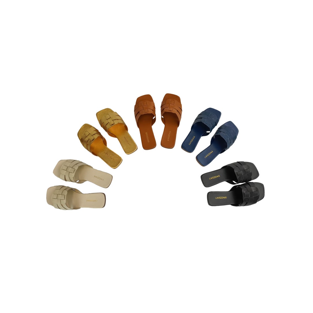 Sandália Rasteira Cavezzale de Couro com tiras entrelaçadas e bico quadrado.